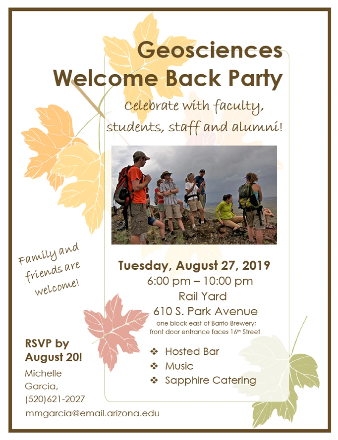 Geosciences faculty, researchers, graduate students, staff, and alumni: Join us for the Geosciences Welcome Back Party on August 27th! Celebrate the beginning of a new school year with food, fun, and games at Rail Yard! RSVP by August 20th. Friends and family are welcome!
